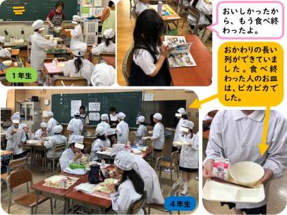 今日の給食は、児童に大好評のメニューでした。4年生の教室では、おかわりの行列ができていました。「今日の給食は、どれもおいしい!!」とごはん粒一つ残っていないピカピカのお皿を見せてくれました。1年生の教室をのぞいてみると、3組では「小おかずがおいしい!!」とみんなが大満足の笑顔でした。「小おかずとはどれのこと?」と聞くと、「白身魚フリッターもとりなっ葉も両方ともおいしい。」と言っていました。2組では「白身魚のフリッターが外がカリッとしていておいしい。」と表現していました。1組では「おいしいから、もう全部食べ終わったよ。」とすぐに食べ終わったことを伝えてくれました。そして、給食時間が終わるまでゆっくりと本を読んでいました。今日は、どの教室も児童のおいしいという笑顔であふれていました。