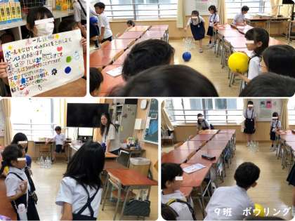 9班のボウリングは、大きいペットボトルを倒すほどポイントが高くなります。大きいペットボトルもどんどん倒すことができていました。