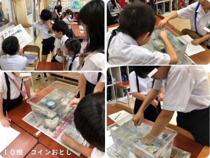 10班のコインおとしは、水槽ごとに難易度が違います。お店めぐりの児童は、難しい水槽にチャレンジしていました。