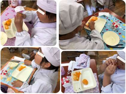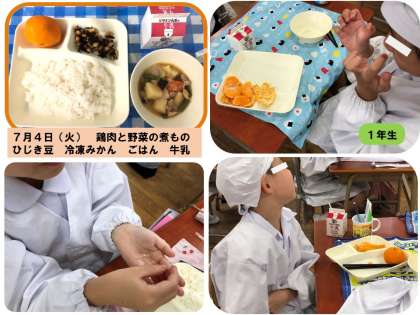 4日(火)の給食に今年度最初の冷凍みかんが登場しました。1955(昭和30)年に小田原駅で販売されたのが始まりだそうです。1年生は初めての冷凍みかんに、手をナフキンやポケットの中で温めたり、こすったり、キーンとなる歯をくいしばったりして食べていました。教室では、「シャリシャリ、ジンジン」「冷たい!!」「甘い!!」「鼻もほっぺも赤くなった。」「今日は暑いから冷凍みかんにちょうどいいねん!!」「天気で選んだのかなぁ?」など、様々な声が聞こえてきました。