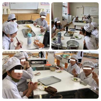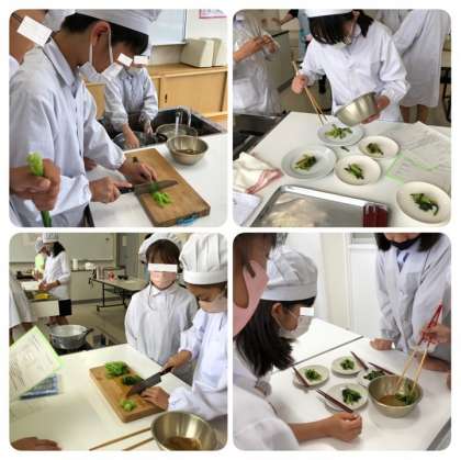 5年生が、家庭科の調理実習で「青菜をゆでよう」という学習をしました。小松菜を使い、あえものを作りました。土などを洗い落とす、沸騰したお湯に根から入れる、水にとる、水気をしぼる、包丁で切る、調味液と混ぜる、皿に盛り付けるという順番で行いました。事前の学習や当日の担任の先生の説明をしっかり聞いていたので、ゆですぎたり、水気がしぼれていなかったりということもなく、小松菜の鮮やかな緑色がきれいな、調味液の味がしっかりしみ込んだ、とてもおいしいあえものができました。