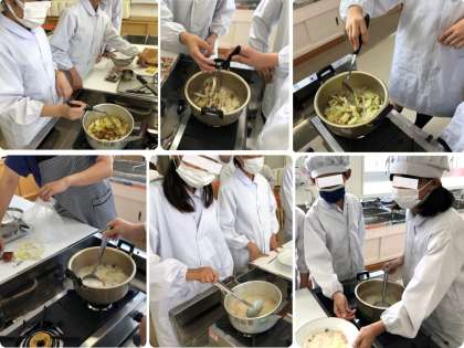 6年生が家庭科で、たまねぎやじゃがいも、しめじ、玉造黒門越瓜、ウインナーなどを炒め、その後煮込んでシチューにする調理実習を行いました。玉造黒門越瓜は、給食委員会の児童が栽培したものです。皮をむき、種をとって使いました。炒める調理は、たまねぎにしっかりと火を通すことから始まります。給食後の調理実習だったので、最初は「おなかがいっぱいで食べられなかったらどうしよう。」と言っていた6年生も、もりもり食べておかわりをするほどでした。できあがりの感想を聞いてみると、「なんとも言えないおいしさ、深い味わいがある。」ということでした。自分たちで分析して、最初にたまねぎから甘みが出るまでしっかり炒めたことがよかったそうです。どの班もとても手際がよく、後片付けも調理実習の振り返りもしっかりできました。振り返りでは、「じゃがいもが少しかたかったので、次はもう少し小さく切ったらいいと思う。」など、改善点を話し合っていました。