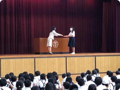 1学期の終業式が行われました。最初に、各学年の児童代表が1学期を振り返ってがんばったことを発表しました。「体育参観をがんばった。」「ひらがなが難しかったけど覚えることができた。」「プールをがんばった。」「習い事のピアノでほめてもらえた。」「行動にメリハリをつけるようにした。」「なかよし班の班長としてみんなをまとめた。」など、それぞれが目標をもってがんばったことをしっかりと発表することができました。また、表彰式も行われ、書写の硬筆や日本語の学習で努力が認められ、表彰された児童の紹介がありました。