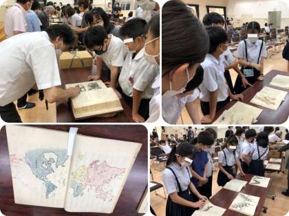 最後に、ヤン・ヨンストンの『動物学全書』やロシアについて書かれた『環海異聞』などを実際に手に取って見せていただきました。児童からは、細部まで詳細に描かれた絵を見て、ページをめくる度に「わー!!」「すごい!!」という驚きの声が上がっていました。また、伊能忠敬によって測量され、製作された『大日本沿海輿地全図』も近くで見ることができました。