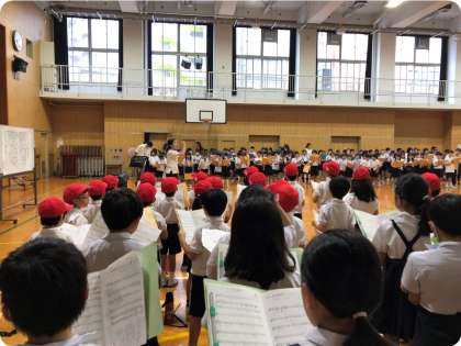 全校児童による2学期最初の音楽朝会がありました。今回で5曲目となります。『レッツゴー!あしたへ』を合唱しました。最初の練習なので、「旋律を感じながら」「拍をとって」「レッツゴーはみんなで元気よく声を合わせて」「はっきりと言葉を言う」など、様々なポイントを教わりました。明るくて元気の出る曲で、歌っていて気持ちがよくなりました。2学期が始まったばかりですが、夏の暑さや夏休みあけの疲れも吹き飛ばすような大きな声で歌うことができていました。音楽朝会が終わり教室に戻る際も、引き続き口ずさんでいる児童の姿が多く見られ、歌うことが楽しいと思っていることがとても伝わってきました。