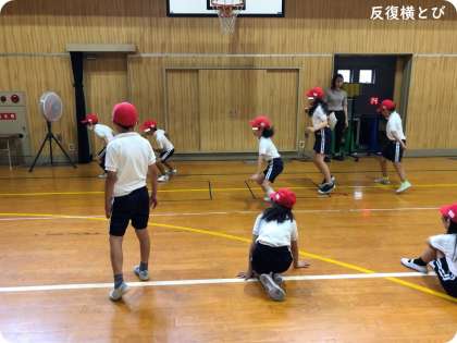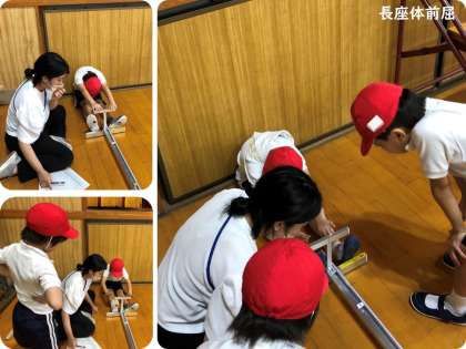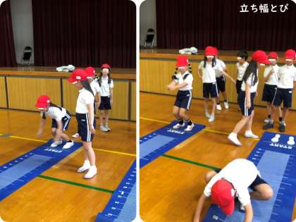 2年生は、体育の時間に新体力テストを行いました。長座体前屈では、膝を曲げずに少しでも前に手を伸ばそうと、どの児童もがんばっていました。それを見ていた周りの友達が集まってきて、「がんばれー!!」と応援していました。反復横とびでは、終わったばかりの児童に感想を聞いてみました。「途中でどこをとんでいるのか、自分が今どこのラインにいるのかわからなくなりそうだった。」ということでした。20秒間で横とびを何回も繰り返すので、そのような感覚になるのかもしれません。立ち幅とびは、助走なしで両足で同時に踏み切るというとび方ですが、2年生は前へ大きくジャンプして、しっかり着地していました。