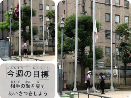 今朝の登校の様子です。3連休明けなので、休みモードから通常モードへの切り替えが難しそうな児童の姿もありました。運営委員会の児童は、毎朝登校すると、国旗と校旗を掲揚しています。登校後に運動場で体を動かしている児童もいます。今週の生活目標は、「相手の顔を見てあいさつをしよう」です。あいさつをすると相手に気持ちのよい印象を与え、コミュニケーションをとることができるだけでなく、自分の疲れやストレスも一旦リセットされて、気持ちよく過ごすことができるそうです。朝からしっかりあいさつをして、元気に過ごしましょう。