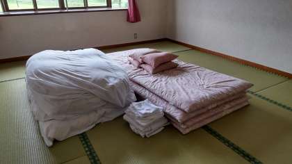 今日の活動の始まりにまずは部屋の片付けです。いろいろ広げていた荷物も片付けて、布団も整理、合格をもらうのに苦労しました。