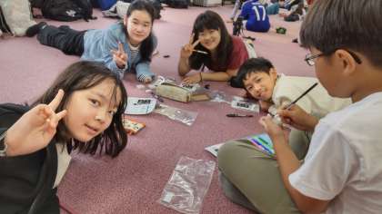 活動班で勾玉のデザインを見せ合いながら作っています。