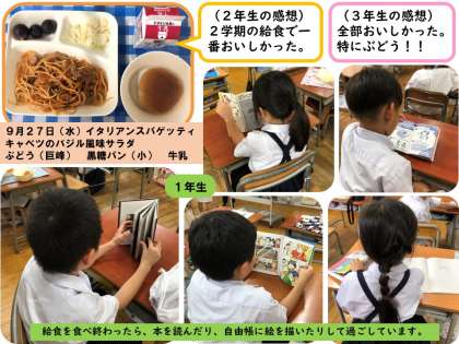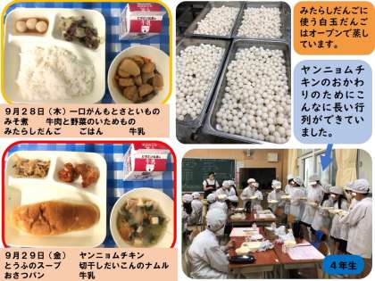 先週の金曜日で9月分の給食が終了しました。最終週の給食も児童はもりもり食べていました。27日(水)の給食は、組み合わせがとても好評で「2学期の給食の中で一番!!」「全部おいしかった。」という感想が聞かれました。巨峰は、長野県産の種なしが納品されました。1年生の教室では、食後に本を読んだり絵を描いたりして、静かに座って待つことができていました。28日(木)の給食は、月見の行事献立でした。みたらしだんごの人気が特に高く、4年生の教室では、みたらしだんごのおかわりに15人ぐらいの児童が並んでいました。29日(金)は、韓国料理のヤンニョムチキンが出ました。料理酒、みりん、こいくちしょうゆ、ケチャップ、コチジャン、水を合わせて作ったヤンニョムというたれが丁度よい辛さで、小学生でもおいしく食べられて大人気でした。10月の給食も楽しみにしていてほしいです。