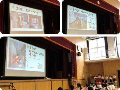 今週は、10月のすこやか週間です。運営委員会から、廊下や階段を走らずに歩くことの大切さについて、委員会発表がありました。3階渡り廊下やワークスペース、1階保健室前の廊下などを走っている人が多く、とても危険であるという内容でした。けがをすると、けがをした人もさせた人も悲しい思いをします。最後に、「右側通行でゆっくり歩こう。けがをさせない!しない!」という呼びかけがありました。けがをしてから、させてからではなく、けがをしない、させない行動をしていきましょう。