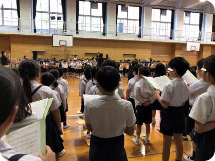 今朝は音楽朝会がありました。1〜5年生で『マイ バラード』を合唱しました。今回は、特別に教頭先生から教わりました。「大阪名物のたこ焼きをほっぺに作るように笑顔で歌う」「明るい歌詞は明るく歌う」「最初の言葉をはっきりと言う」「3連符のリズムが続くところは、だんだんと強くしていく」などがポイントだということで、それらを押さえて練習しました。児童は、マイバラードをより上手に歌うために、教わったポイントを意識して歌っていました。5年生と6年生が別のパートを担当していますが、今日は6年生が修学旅行中だったので、5年生だけでがんばりました。5年生だけとは思えない声量と澄んだ声で、1〜4年生にしっかり合わせていました。最後に、楽譜を見ずに歌うことができる人は見ないようにし、終わりの部分のハミング(口を閉じ、声を鼻に抜かしてメロディーだけで歌うこと)まで全員で歌うことができました。お腹から声を出し、リズムにのって歌ったことで、朝の気温が低い今の季節ですが、体がポカポカと温かくなりました。