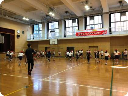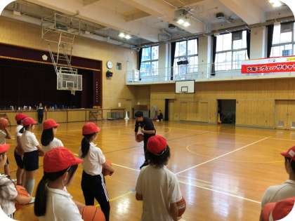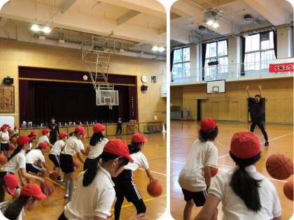 1時間目に5年生で夢・授業が行われました。トップアスリートを講師に招き、児童が夢を育み、スポーツへの興味・関心を喚起することを目的にしています。本日は、大阪エヴェッサからバスケットボールの指導にお越しいただきました。コーチに教わりながら、右手でのドリブルや左手でのドリブルなど、次々に練習を行いました。また、下を向いていると、ディフェンスをするにもオフェンスをするにも、相手やチームの仲間を見ていないことになり、ボールをとられてしまったり、ぶつかったり、上手にパスができなかったりすることがわかりました。そこで、さっそく、上を向いてプレイするために、コーチが両手で示した数字のかけ算をしながらドリブルをする練習もしました。