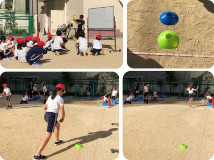 5年生は、体育の時間に走り幅跳びの学習を行っています。踏み切りまでのリズムや力強い踏み切り、空中姿勢と着地の感覚をつかむために、3か所に分かれて課題に取り組み、その後、自分に合った助走距離をみつけることを意識しながら跳躍を行いました。児童は、6m、7m、10mなどと様々な所にマーカーコーンを置き、どの助走距離の時にリズミカルにスピードを上げて踏み切ることができるのかを確認していました。ファールや着地点を見る、メジャーで測定する、砂場をならす、記録をするなどの役割は、同じグループの人達が分担していました。どの児童もメジャーの合わせ方や着地点の見方などをしっかりと理解し、跳躍を行った児童に「踏み切り板から〇〇cmぐらい足が出ていた。」「ここに体がついてしまったから距離が伸びなかった。」などのアドバイスもしていました。自分の課題に気付き、意識しながら繰り返し練習したことで、一人一人が記録を伸ばし、達成感を味わうことができました。