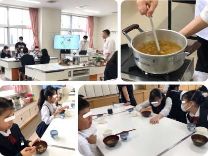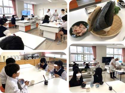 5年生は、五感の全てを使って料理を味わうという経験をし、さらに、料理を作っていただいた方々への感謝の気持ちやだしの食文化について学ぶことができた喜びなどを心でも感じることができました。最後に、児童からの質問にもお答えいただき、だしはその場で簡単にとることもできますが、時間をかけて丁寧にうま味を出すことを大切にされていること、また、季節感や香り、彩りなどを考えて日々調理されていることなどもお話していただきました。今回、『西心斎橋ゆうの』の皆様には、このような貴重な機会をいただき、本当にありがとうございました。