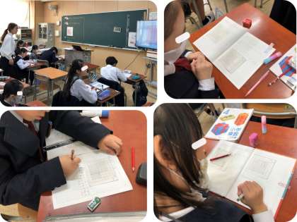 4年生は、算数で複合図形の面積を求める学習をしました。L字のような複合図形の面積を求める時、既習の縦×横だけでは問題を解くことができず、図形を分割したり、補完したりすれば、長方形や正方形の面積を求める公式を使うことができるということに気づきました。そこから各自で工夫して、複合図形の面積の求め方をノートに書き、その後、班で交流し、さらに、全体でも共有しました。同じL字のような複合図形の面積の求め方でも、自分の考えを説明したり、友だちの意見を聞いたりすることで、様々な方法があるということがわかり、その中でどの方法がより効率よく面積を求めることができるのかについても話し合いました。最後の振り返りでは、L字のような形の面積は、移動させたり、補ったり、分けたりして長方形や正方形にすると求めることができるとまとめました。