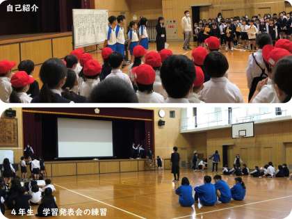 本校の卒業生で、東中学校の2年生である生徒4名が職場体験にやってきました。懐かしい顔ぶれですが、背が高くなり、大きくなっていました。今朝は、体育館で音楽朝会をしていたので、その様子を見学し、音楽朝会終了後に全校児童の前で自己紹介をしました。名前を言うだけでなく、「歌がすごく上手でしたね。」と音楽朝会の感想も伝えてくれたことで、本校の児童はとてもうれしい気持ちになっていました。そこから、「中学生知ってる!!私たちが1年生の時の6年生や〜!!」などと口々に話をしていました。教室に入って授業を参観したり、休み時間には低学年の児童と遊んだりしました。学習発表会の練習では、小学生の時は舞台に立つ側だった中学生が、今は、先生の側から全体を見ていました。本校の児童にとっては、緊張感をもって本番のように練習することが大切ですが、中学生が目の前で見ていたことで、見られている緊張感を感じながら練習することができました。給食時間には、質問タイムもありました。「中学校の1時間は何分ですか。」「運動場は広いですか。」「クラブは何をやっていますか。」など、児童からのたくさんの質問に丁寧に答えていました。クラブ活動では、様々なクラブを回っていましたが、手作りクラフトクラブでは、作り方の用紙をさっと見るだけの初見ですぐに児童にわかりやすく教えてくれていました。そのおかげで、作品を最後まで仕上げることができました。今日1日フル活動だったので疲れたと思いますが、また明日も元気に職場体験にきて、本校の児童とたくさん関わってほしいです。