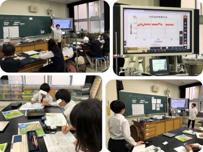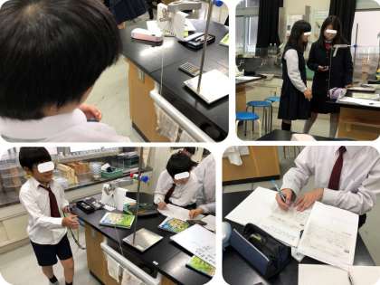 5年生は、理科の学習で「ふりこの振れ幅を変えると、1往復する時間は変わるのだろうか。」について考えました。おもりの重さやふりこの長さは同じで、振れ幅のみ10、20、30度と変えます。また、時間の測定の誤差を少なくするために複数回実験を行い、それを平均します。実験後、表に記録しておいた測定結果をグループごとに発表しました。そして、全てのグループの結果から、振れ幅を変えても1往復する時間はほぼ変わらないことがわかり、全体で確認しました。次の時間は、ふりこが1往復する時間に関係していると思う条件のうち、おもりの重さを変えて実験します。