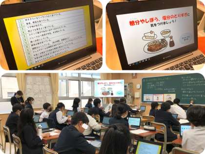 6年生は、保健の学習で生活習慣病の予防のしかたについて考えました。最初に、日本人の死因の上位を占める心臓病や脳卒中などは、生活のしかたが原因で起こることが多い病気で生活習慣病と呼ばれていること、また、心臓や脳の血管が硬くなったり破れたりする原因には、食生活や運動、ストレスなどがあることを確認しました。そして、事前に行った生活のしかたに関する調査より、気を付けていないという児童が多かった「スナック菓子や甘いおやつはひかえている。」という項目について考えました。様々なおやつの例から自分が普段よく食べているものを選んだ時、砂糖や塩をどれほどとってしまうのか一人一台端末を使って調べ、隣の人と交流した後、全体でも共有しました。甘いおやつや塩辛いおやつばかりに偏るなど、各自のおやつの食べ方がよく表れており、児童からも「思っていたよりオーバーしていた。」などの意見が聞かれました。最後に、これから気を付けたい食生活について、一人一人の課題を考えました。食事や睡眠、運動、ストレスなどの生活は、子どものうちに習慣づいてしまうため、今からの生活が大切であるとまとめました。