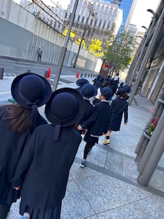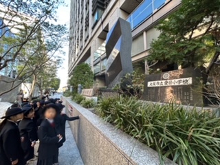 愛日小学校の跡地である淀屋橋オドナに行きました。地下には愛日小学校の写真が飾ってあり、「記念室にある書だ!」と驚いていました。建物の裏手には、跡地の記念碑と創立百周年の記念碑があり、子ども達は、歴史がある学校だったことを、改めて感じていました。