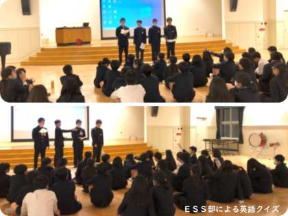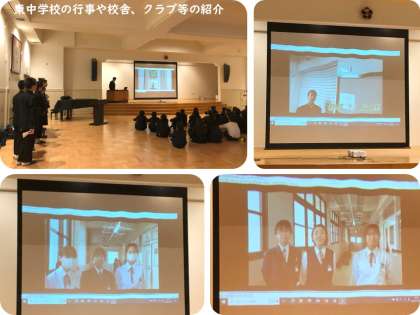 東中学校の生徒会とESS部の皆さんが、6年生に中学校のことを紹介するために来校しました。最初に、中学校の行事や校舎の様々な場所、クラブ活動などについて、映像で紹介がありました。その後、ESS部の皆さんによる英語クイズが行われました。クイズでは、3つのヒントが英語で出され、そのヒントから何のことを言っているのかを英語で答えます。全部で10問ありました。6年生は、ヒントを聞き逃さないように集中して聞いていました。正解した時は、Yes,that's right!と言われ、とてもうれしそうでした。