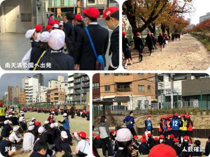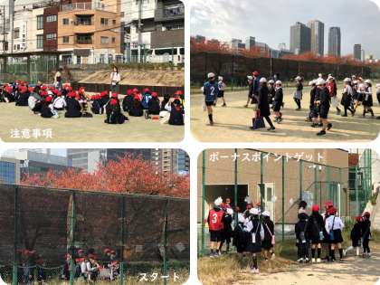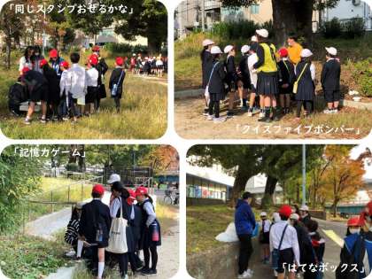天候にめぐまれ、紅葉が色鮮やかできれいな南天満公園において、全校オリエンテーリングを行いました。なかよし班で協力して、地図を見ながら『なかよしポイント』を回ります。なかよしポイントでは、担当の先生がゲームやクイズを準備しています。移動している先生を探すことができたら、ボーナスポイントがもらえます。スタートと同時にさっそく班のみんなでなかよしポイントへ向かっていました。