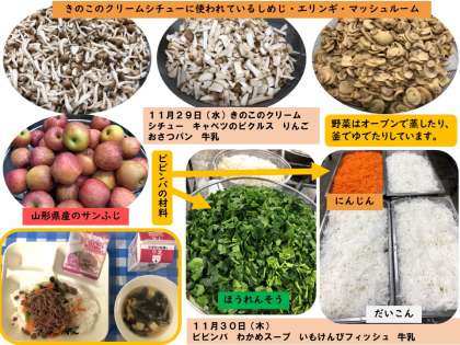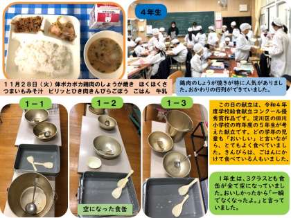 今日は、11月分の給食の最終日でした。11月も様々なメニューが登場し、児童はいつも楽しみにしていました。学校帰りに給食室の前を通る時、「やったー!!明日スパゲッティや。おいしそう。」「明日、ビビンバやって!!」など、給食を楽しみにしている様子を見ることができました。今回、初めて焼きシューマイが登場しました。今までは油で揚げていましたが、焼きシューマイの方が油が少なくヘルシーに仕上げることができます。焼いていても、外側はパリッとしていて中はやわらかく、かんだ時に肉汁が出てきました。28日の令和4年度学校給食献立コンクール優秀賞作品は、特に人気がありました。1年生のどのクラスをのぞいてみても食缶が全て空っぽでした。「全く残ってないね。」と聞くと、「そうだよ。一瞬で空になったよ。」と言っていました。また、「みそ汁に入っているさつまいもは秋においしいものだね。」「きんぴらはごはんにかけたらおいしい。」などの声も聞かれました。12月の給食もお楽しみに!!