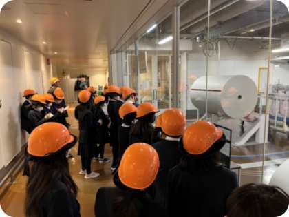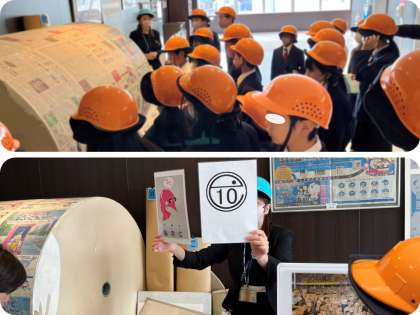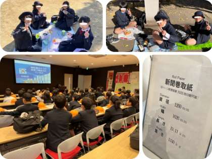 5年生は、福島区にある朝日新聞大阪工場へ社会見学に行きました。見学の前に、工場近くにある公園でお弁当を食べました。工場では、最初に記念撮影をした後、新聞ができるまでの工程など、新聞社ではどのような仕事が行われているのかをビデオで見ました。そして、輪転機を使っての新聞印刷の仕組みを説明していただき、実際に輪転機の巨大システムを見学しました。幅1.6m、重さ1.3t、長さ19kmもあるロール状の巻取紙を使って印刷しますが、8ページの新聞に換算すると3万5千部も印刷が可能だそうです。
