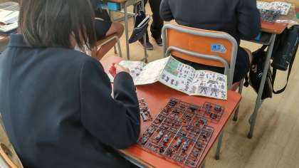 本日、6年生はガンプラを作っています。外したランナーは再利用します。SDGsを意識した学習ですが、細かな作業は大変そうです。頑張っています。