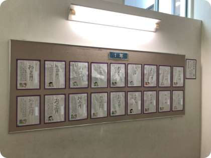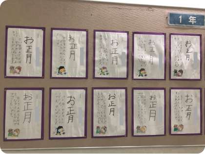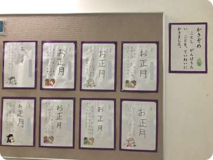 東校舎の階段の踊り場に1年生の書き初めが掲示されています。「今年がんばりたいことを、ていねいに書きました。」との紹介がありました。「かぜをひかないようにげんきにがんばりたい。」「じぶんのことはじぶんでやりたい。」「たくさんのともだちとなかよくえがおですごしたい。」「しせいをぴんとのばして、むずかしいべんきょうもがんばる。」「たくさんれんしゅうして、てつぼうのさかあがりをがんばる。」「すいえいでひらおよぎやバタフライをがんばる。」「ピアノのれんしゅうをつづけて、いろんなきょくをひきたい。」など、勉強や生活習慣、友だちとのこと、習い事など、様々な目標を書いていました。それぞれの児童がどのような思いをもっているのかを知ることができ、目標に向かってチャレンジし、ぜひ達成してほしいなという気持ちになりました。