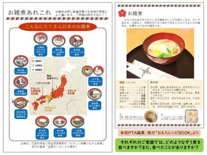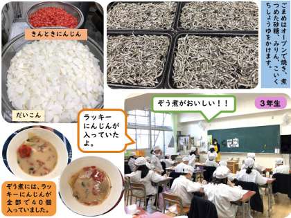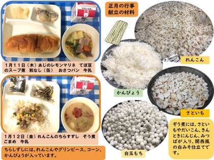 12日(金)は、正月の行事献立でした。れんこんやグリンピース、コーン、かんぴょうが入ったちらしずし、さといもやだいこん、きんときにんじん、みつばが入った関西風の白みそ仕立てのぞう煮、ごまめが出ました。その他にも給食では、紅白なますや黒豆の煮もの、くりきんとんが登場します。ご家庭ではどのようなぞう煮を食べますか?日本全国、地域や家庭によっても具材や味付けが様々です。例えば、「田舎が岡山県なので、ぶりの入ったぞう煮を食べます。旅行で島根県へ行き、小豆の入ったぞう煮を食べたことがあります。給食では、白みそ仕立てのぞう煮を食べます。」など、どのようなぞう煮を食べているのか話をするだけでも興味深いと思います。また、ご家庭でもお話してみてください。学校でも友だちや先生など、周りの人たちに聞いてみたらきっと楽しいですね。おせち料理に込められた願いを知り、それぞれの地域や家庭の味を大切に受け継いでいけたらと思います。