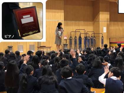 今朝の児童朝会で、表彰式がありました。3年生の児童が、ピアノのコンクールで優秀な成績を収めたことが紹介され、全校児童の前で表彰されました。