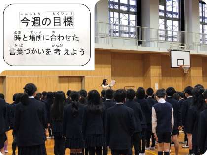 今週の生活目標は、『時と場所に合わせた言葉づかいを考えよう』です。担当の先生から、職員室に入る時の言葉、授業中、友だちと話をする時など、それぞれ言葉づかいが違うので、自分で考えてその場に合った言葉をつかっていくことの大切さについてお話がありました。
