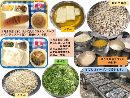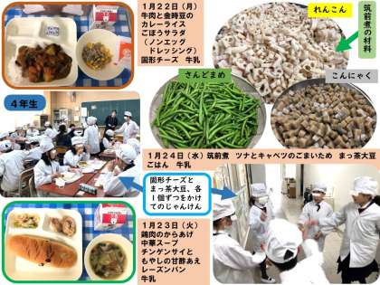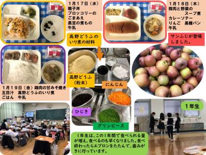 18日(木)のカレーソテーが、とても人気がありました。ピーマンともやし、ささみを油でいため、塩、こしょう、カレー粉で味つけしています。カレー粉の風味が何とも言えないおいしさでした。この日のりんごは、長野県産のサンふじが登場しました。今年度は、これで最後の登場になります。また、来年度をお楽しみに!!19日(金)の高野どうふのいり煮は、カルシウムが豊富なメニューでした。カレーライスには、給食調理員さんがラッキーにんじんを全部で45個入れてくれていました。本校は、400人以上が給食を食べているので、なかなかラッキーにんじんは当たりません。児童は、型を抜いた外側のにんじんでも見つけたら大事に食べています。固形チーズやまっ茶大豆などの個数ものは、1〜2個のおかわりをめぐっていつもじゃんけんの熱い戦いが繰り広げられています。3学期になり、今年度の締めくくりの学期になって、最近は、筑前煮や焼き魚など、以前なら苦手だと言って残食が多くなってしまっていたメニューでも、とてもしっかり食べるようになっています。毎日、ほとんど残食がありません。1年間のそれぞれの児童の成長を感じます。