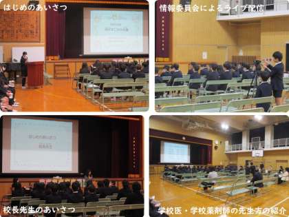 14日(水)に令和5年度の開平すこやか会議を開催しました。テーマは「健康で安全に楽しく学校生活をおくろう」です。体育館には5・6年生、学校医と学校薬剤師の先生方、PTA役員や保護者の皆様が集まり、1〜4年生は各教室でライブ配信を視聴しました。司会進行は6年生が、ライブ配信のカメラは情報委員会が担当しました。