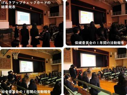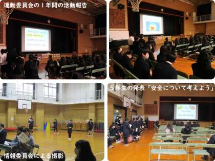 保健・給食・運動委員会は、げんきアップチェックカードの結果や1年間の活動のようすを報告しました。5年生は、総合的な学習の時間に「安全について考えよう」をテーマに、けが防止の観点から学校の危険な場所や対策などについて調べたり考えたりしたことを発表しました。