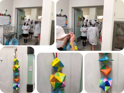 給食週間中に各学級から給食調理員さんへ感謝のメッセージが届きましたが、最後を締めくくったのは6年生でした。「6年間、いつもおいしい給食を作ってくださってありがとうございました。残り1か月と少しですが、残りの給食もよろしくお願いします。」と代表の児童があいさつをした後に、メッセージが書かれた多面体の飾りがプレゼントされました。「いつも元気が出るおいしい給食をありがとうございます。」「毎日朝早くから給食を作ってくれてありがとうございました。」などのメッセージが書かれていました。
