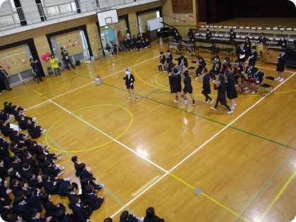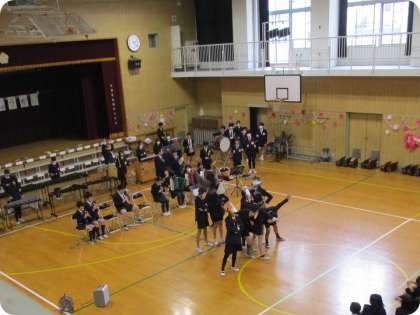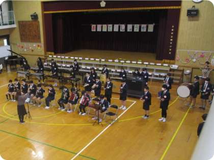 6年生からは、お礼として「名探偵コナンメイン・テーマ」の合奏がありました。合奏の中で、登場人物のお面をかぶった6年生が登場すると、見ている1〜5年生から「ワー!!」「キャー!!」という歓声が上がり、体育館中がとても盛り上がりました。6年生も楽しんで、体を大きく動かしながら乗りに乗って演奏していました。演奏が終わってから6年生の代表児童が、「開平小学校の楽しい思い出を胸に中学校へ羽ばたいていきます。」というあいさつをしていました。
