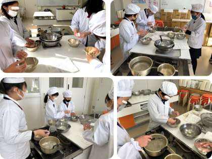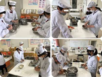 みたらしあんは、少量の砂糖やしょうゆ、水を火にかけながら混ぜ、最後に水どき片栗粉を入れてとろみをつけます。弱火で常に混ぜ続けないと焦げてしまうことや水どき片栗粉とはどのようなもので、どうやってとろみをつけるのかなど、5年生の多くが初めて経験する調理法だったと思います。どの班も混ぜる人、水どき片栗粉を入れる人などと分担して、売っているみたらしだんごのようなおいしそうなあんを作ることができました。