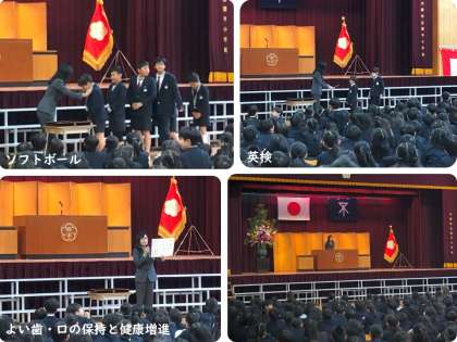 表彰式では、開平子ども会がソフトボール大会で準優勝したこと、1年生と2年生の児童が英検3級と2級に合格したことなどが紹介され、大きな拍手が送られました。また、「よい歯・口の保持ならびに健康増進について小学校での保健活動に尽力した」として、本校が表彰されました。