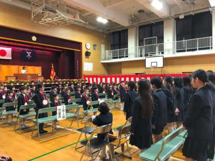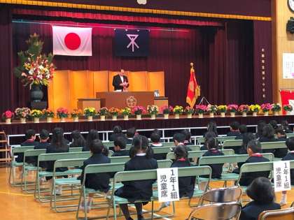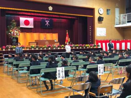 学校長式辞では、1年生がこれから学校のことを教えてもらったり、なかよし班活動などでお世話になる6年生の紹介もありました。わからないことや困ったことがあったら、優しいお兄さん、お姉さんたちに聞いてください。担任の先生の発表では、「どんな先生なんだろう!!」と真剣に見ていました。PTA会長の祝辞では、学校生活が楽しみになるお言葉をいただきました。