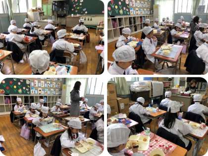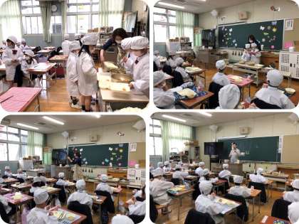 初日なので、大おかずやごはんなどの盛り付けは教職員が行い、比較的簡単な盛り付けにさっそくチャレンジしていました。友だちの机に盛り付けられたおかずなどを配りますが、配り忘れがないように、列ごとに順番に配っていました。「いただきます」のあいさつをして、いよいよ初めての給食を食べます。「ストローのとんがっている方をさします。牛乳パックのここをめくります。」など、牛乳のストローのさし方を教わって上手に飲んでいました。お椀を持って姿勢よく食べている1年生が多かったことに驚きました。
