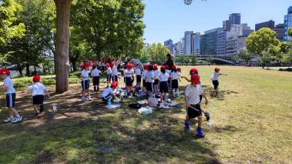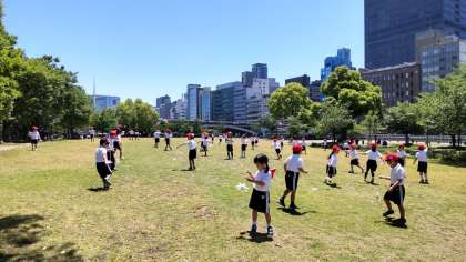 さて、次は風車を回します。学校で作ってきた自分の風車を持って、芝生広場を走り回ります。