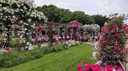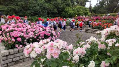 さて、次はバラ園に移動です。きれいなバラに囲まれていますが、お腹が空いたという声も聞こえます。
