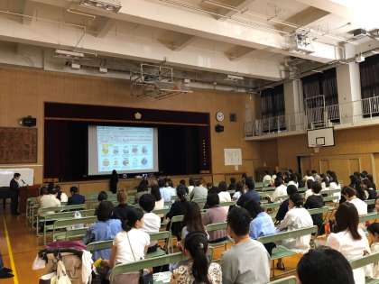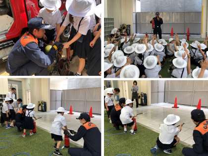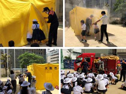 学習参観後に、PTA予算総会が体育館で開かれました。運動場と開平オアシスでは、1〜3年生、4〜6年生の順で防災訓練を行いました。中央消防署の方々にお越しいただき、煙中避難訓練や消防車見学、消火訓練を体験させていただきました。煙中避難訓練では、火事の時は煙を吸って動けなくなることが多く、煙は上にのぼっていくので、しゃがんで口にハンカチなどをあてて避難することが大切であることを教わりました。消防車見学では、消防車の中にお風呂3杯分程度の水を入れておく水槽があること、それ以上に大量の水が必要な場合は、消火栓から水を出すことができることを教わりました。
