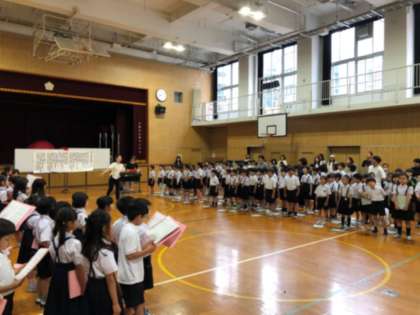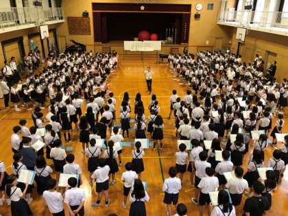 昨日は、2回目の全校音楽朝会参観の日でした。朝早くからたくさんの保護者の皆様にご来校いただきました。ありがとうございました。曲名は、1回目に引き続き『ぼくらのチカラ』です。今回は、1〜4年生と5・6年生に分かれて、二部合唱の練習を行いました。二部合唱のそれぞれのパートの練習方法や全校児童でどのように声を合わせて一つの曲をつくりあげていくのかという過程もご覧いただけたと思います。最後に全体を通して合唱し、保護者の方々から大きな拍手をいただけたことが、児童はとてもうれしそうでした。体育館から教室に戻る時に親子で手を振り合ったり、目と目で合図をしたりする様子も見られました。次回の全校音楽朝会参観は、9月12日(木)8時30分から体育館の予定です。曲名は『Wish 夢を信じて』です。次回もぜひご参観ください。