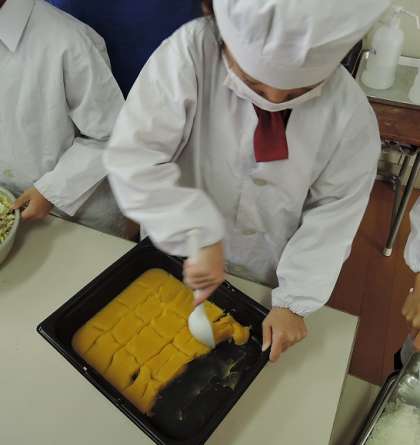 給食では手作りでできるものはできるだけ手作りで!と心がけていますが、「ういろう」もその一つです。そして今日は、かぼちゃが入った「かぼちゃういろう」。上新粉、砂糖に、ペースト状のかぼちゃを加えて蒸します。甘さ控えめに仕上げたういろうは、いつも大好評です。かぼちゃ以外に、抹茶が入った「抹茶ういろう」や何も加えない白い「ういろう」が給食では過去に登場しています。