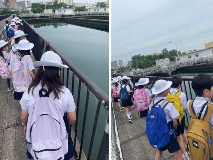 4年生は、社会科で自分たちが使う水がどこからくるのか、安心して飲める水にするためにどのような処理がされているのかなどについて学習しています。6月17日には、社会科の学習の一環で、柴島浄水場に見学に行きました。映像で浄水場の仕組みを説明していただき、その後、凝集沈殿池や排水処理施設、急速砂ろ過池、高速浄水処理棟などの施設を見学しました。また、参加型の実験で浄水処理工程の一部について、模型で実際に体験することもできました。私たちのくらしに欠かすことのできない、密接に関係している水ですが、多くの工程やたくさんの方々の働き、努力によって安心して飲むことができていることがわかりました。その後、見学でわかったことを生かして、社会科の学習にしっかり取り組むことができました。