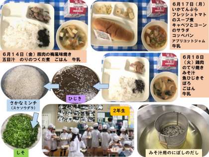 6月後半の給食は、暑さと湿度の高さで食欲がおちる中でも食べやすいように、梅肉やしょうが、ゆず果汁など様々な味付けの給食が登場しました。のりのつくだ煮や魚ひじきそぼろなど、ごはんに添えるおかずもあり、ごはんが食べやすかったです。6月14日(金)は、全校オリエンテーリングの日でした。オリエンテーリングでおなかをすかせていた児童からは、「今日の給食は、大満足の献立やった!!」という感想が聞かれました。季節の果物のさくらんぼや夏が旬のトマトを使ったスープ煮、オクラのあえ物など、夏を感じることができました。