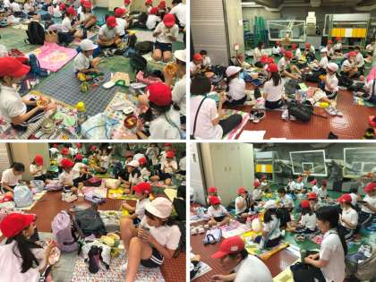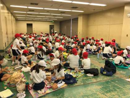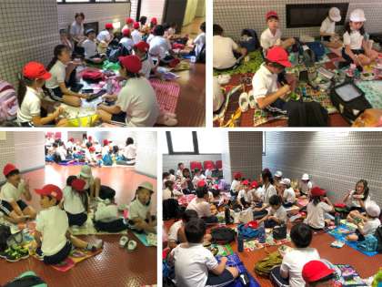 お弁当の時間です。なかよし班で集まって食べました。午前の部でたくさん運動したのでお腹がすいていたと思います。なかよし班の班長の「いただきます!!」という言葉で、どんどん食べていました。レジャーシートを広げて、学年に関係なくみんなでお弁当を食べるというとてもうれしい経験ができました。